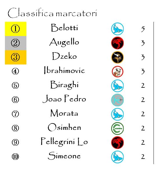 Sono state tante altre le reti che non abbiamo potuto convertire in marcature utili alla nostra graduatoria: ne hanno perse una Ibrahimovic e Lukaku (Aquilonia), Dzeko (Brythunia), Soriano (Zingara), Pezzella (Corinthia), Politano (Zamora), Djuricic (Stygia), Pedro e Lapadula (Ophir) e Lammers (Koth).