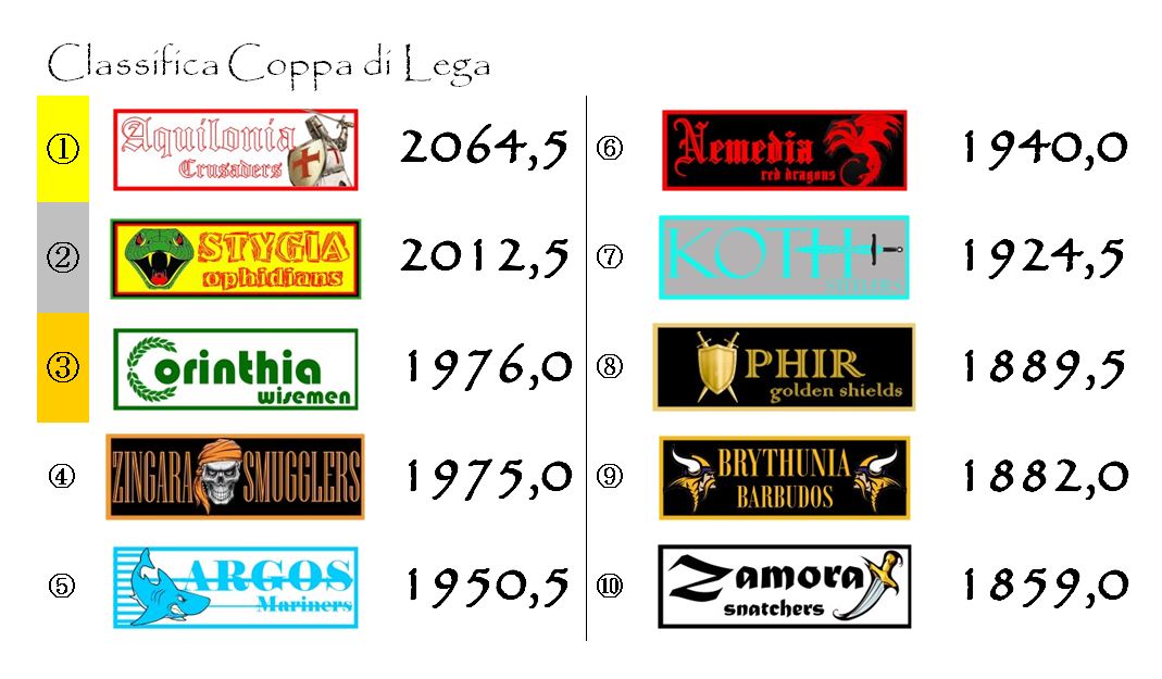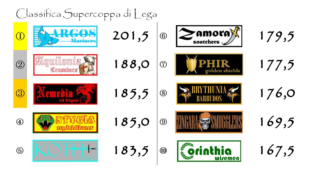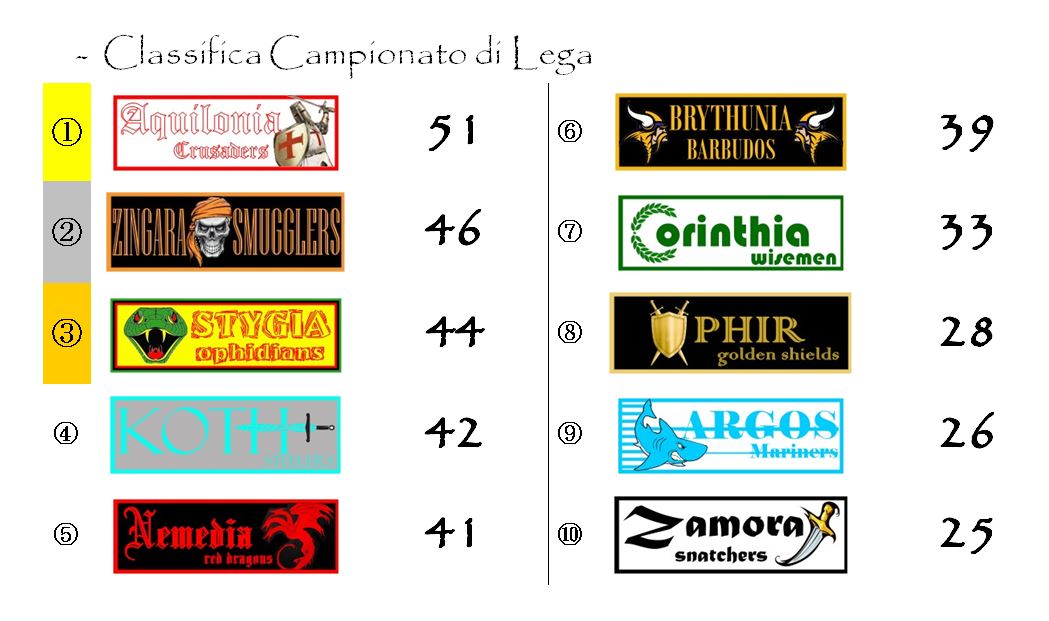 Ad un solo girone dal termine della stagione Aquilonia ha più di cinquanta punti di vantaggio sulla Stygia. I Crusaders hanno aumentato ulteriormente il gap sugli Ophidians e, a meno di clamorosi rovesci, si avviano a vincere in tranquillità il secondo Elmo d’Oro della loro storia.