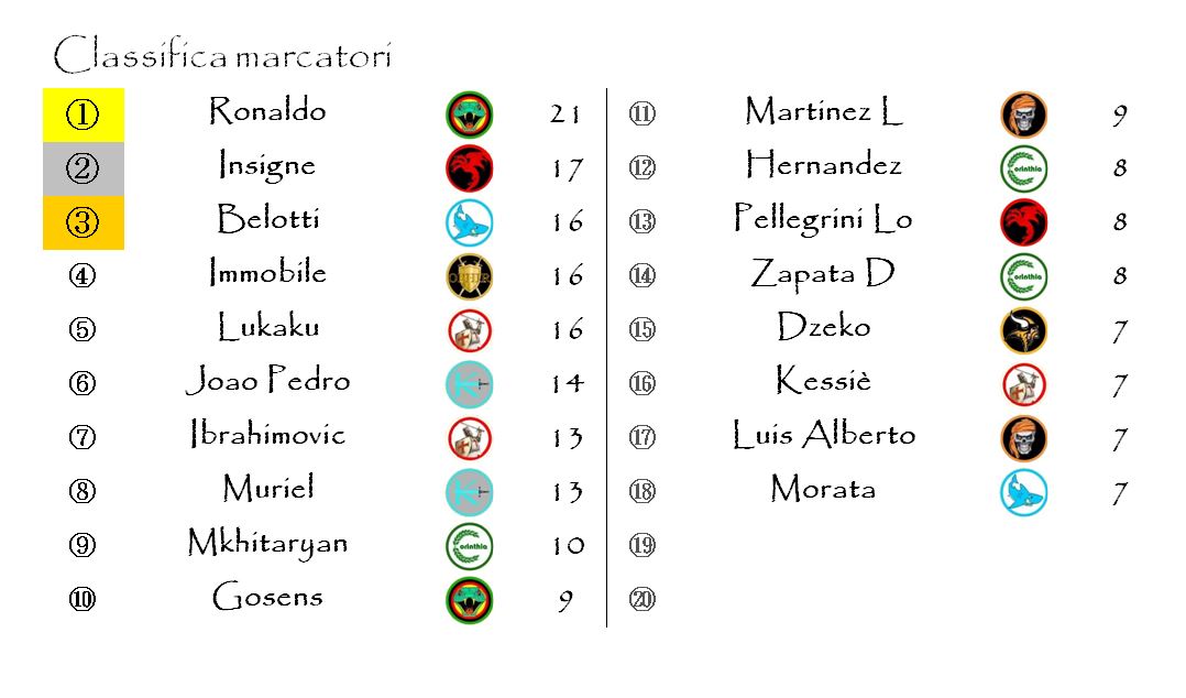 Andrea Belotti e, soprattutto, il detentore Ciro Immobile, sembrano aver ammainato bandiera bianca. Entrambi sono stati sorpassati in seconda posizione da Lorenzo Insigne, capitano e trascinatore dei Nemedia Red Dragons.
