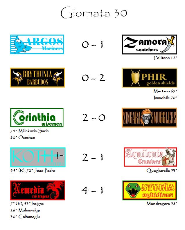 L’equilibrio della sfida tra Brythunia e Ophir (com’è accaduto per quella tra Corinthia e Zingara) si è rotto nel secondo tempo di Napoli-Lazio. Dries Mertens e Ciro Immobile hanno regalato il successo agli ospiti che si sono imposti col punteggio di 0-2.