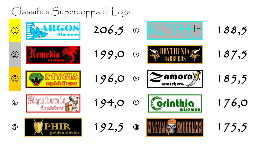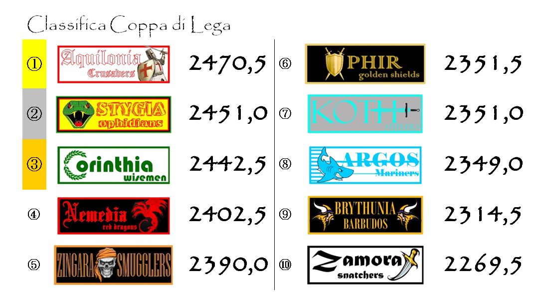 Il terzetto di testa della Coppa di Lega sta sempre più stretto. Corinthia ha recuperato più di venti punti sia su Aquilonia che su Stygia e nelle ultime tre giornate può provare a metterle davvero sotto pressione.