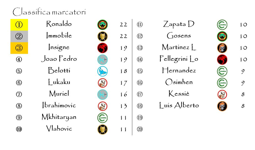 Gli unici a muovere la classifica dei marcatori nelle zone più alte della classifica sono stati Joao Pedro e Muriel mentre ha fatto il suo ingresso nella Top 20 il nigeriano Viktor Osimhen.