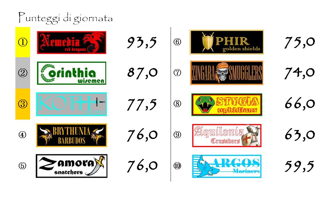 Gli incroci più ad alta tensione di questo infrasettimanale saranno quelli tra la neo-capolista Nemedia che ospiterà al Belverus Dome proprio quella Brythunia che nelle ultime tre giornate ha sconfitto tutte le prime della classe e quello dell’Ocean Mancera di Kordava tra Zingara e Koth che rappresenta u vero e proprio spareggio tra due squadre che potrebbero ancora dire la loro anche nella corsa alo Scudo d’Oro.