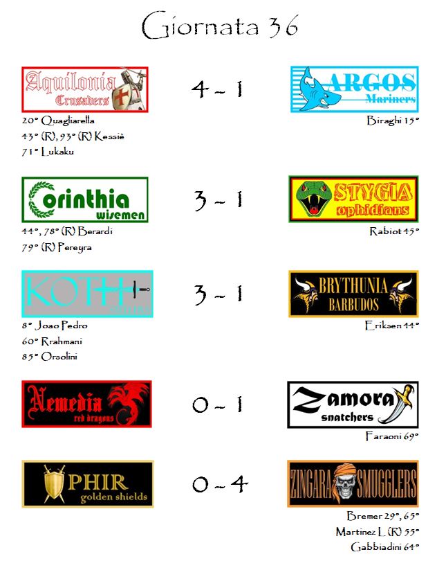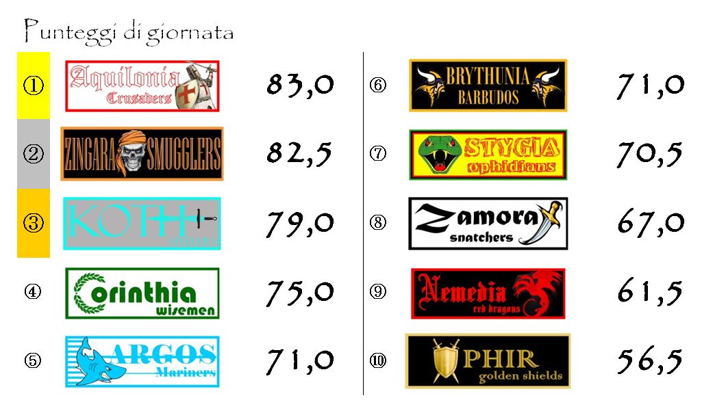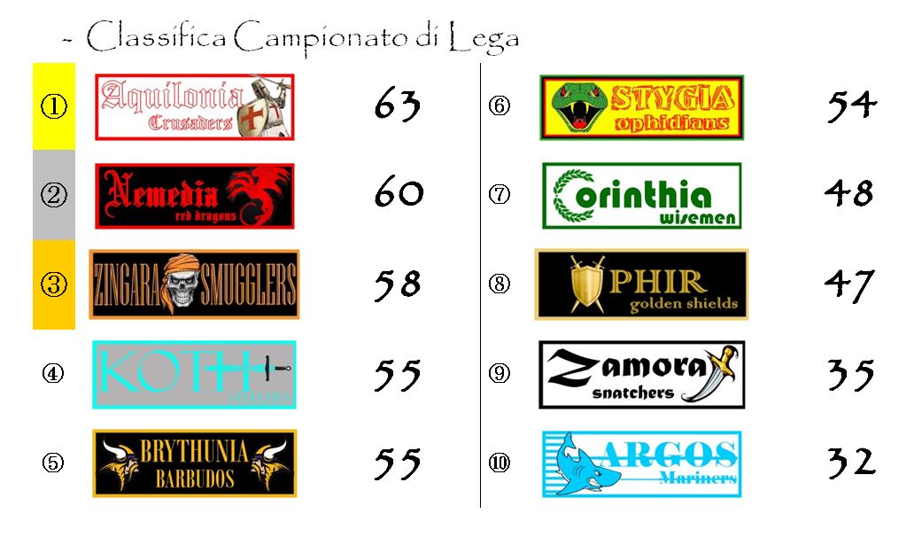 La prima giornata della prossima stagione, la quinta della nostra saga, si aprirà, come da tradizione, con la sfida tra la detentrice del titolo e l’ultima classificata. Si comincerà, dunque, con un remake immediato di Aquilonia–Argos, partita giocata in questo week-end e che ha consacrato i Crusaders campioni.