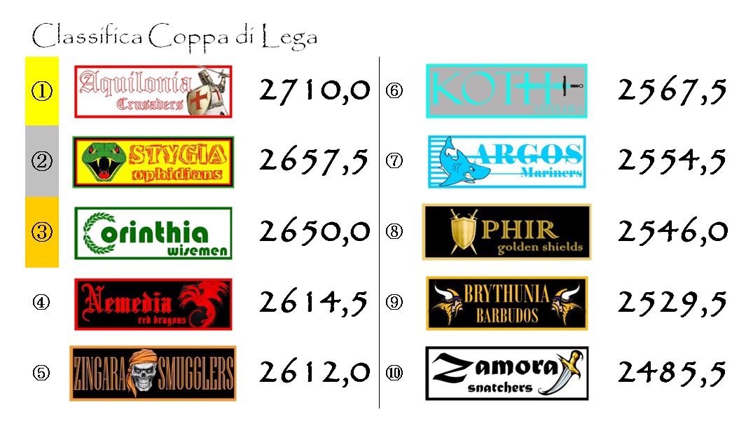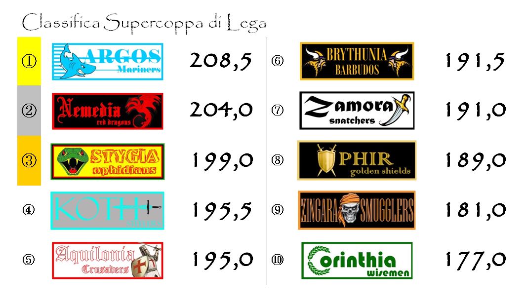 L’Elmo d’Argento è andato alla Stygia, detentrice del trofeo, che ha resistito agli assalti finali di una Corinthia giuntale ad appena 7,5 punti di distanza. Corinthia che si sarebbe aggiudicata lo Scudo d’Argento se solo oggi avessimo scelto di puntare su Chiesa e Mkhitaryan anziché su Zapata e Osimhen. Fantascienza ovviamente…