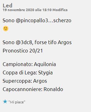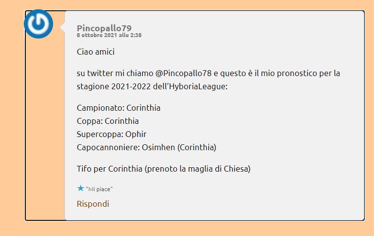Inserisco qui di seguito un “commento tipo”. Ricopiatene pedissequamente la forma, con i vostri pronostici, in modo da non sbagliare.