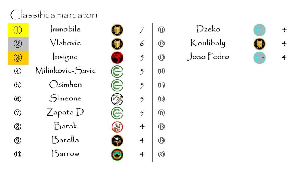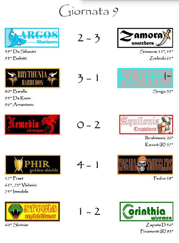 Le due marcature extra che abbiamo potuto assegnare in questa nona giornata sono andate a Niccolò Barella dei Brythunia Barbudos e a Milan Skriniar degli Stygia Ophidians.