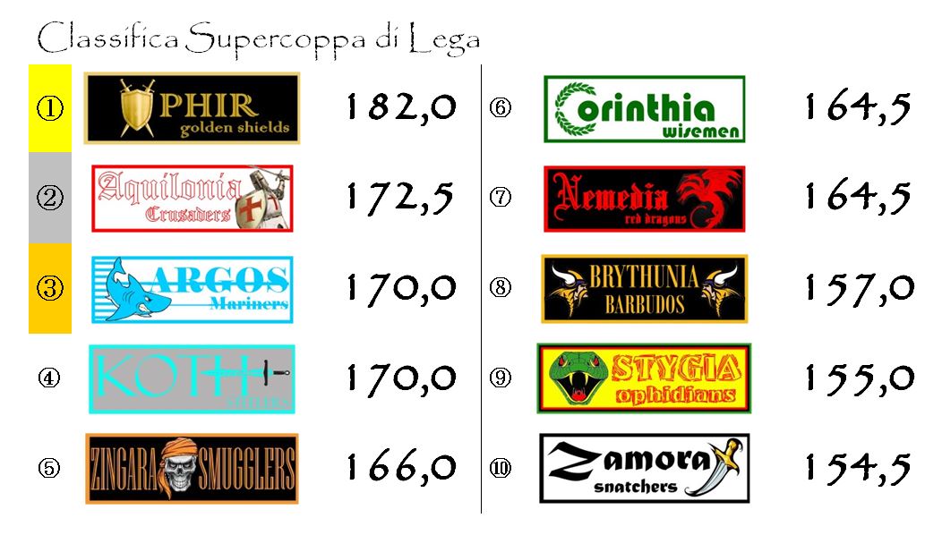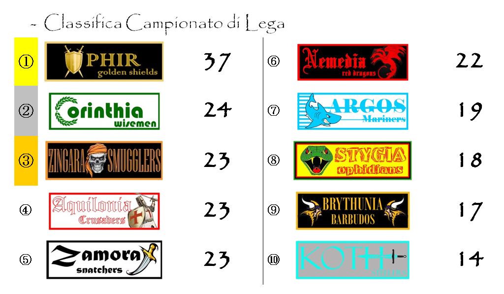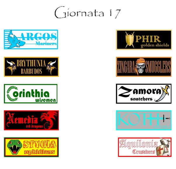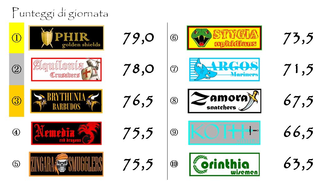Stygia e Brythunia, ad esempio, battendo Aquilonia e Zingara potrebbero ridurre notevolmente il gap che le separa dal gruppetto che al momento occupa le posizioni più nobili della classifica.