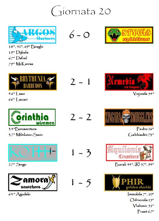 In mancanza di bonus-goal, i Dragoni sono riusciti a dar filo da torcere agli avversari grazie agli assist di Felipe Anderson e dei subentranti Mergim Vojvoda (all’esordio assoluto in Hyboria League) e Viktor Kovalenko, alle ottime prestazioni di Provedel (decisivo a San Siro contro il Milan) e ad una difesa in grado di conquistare un punto extra.