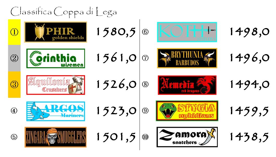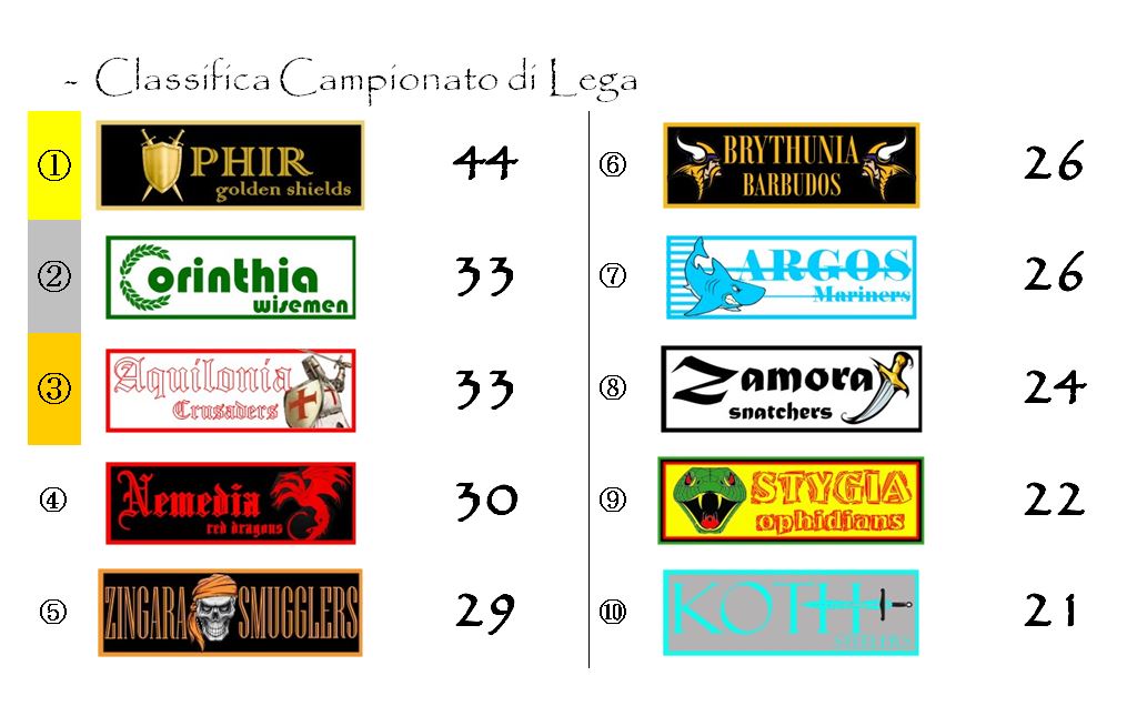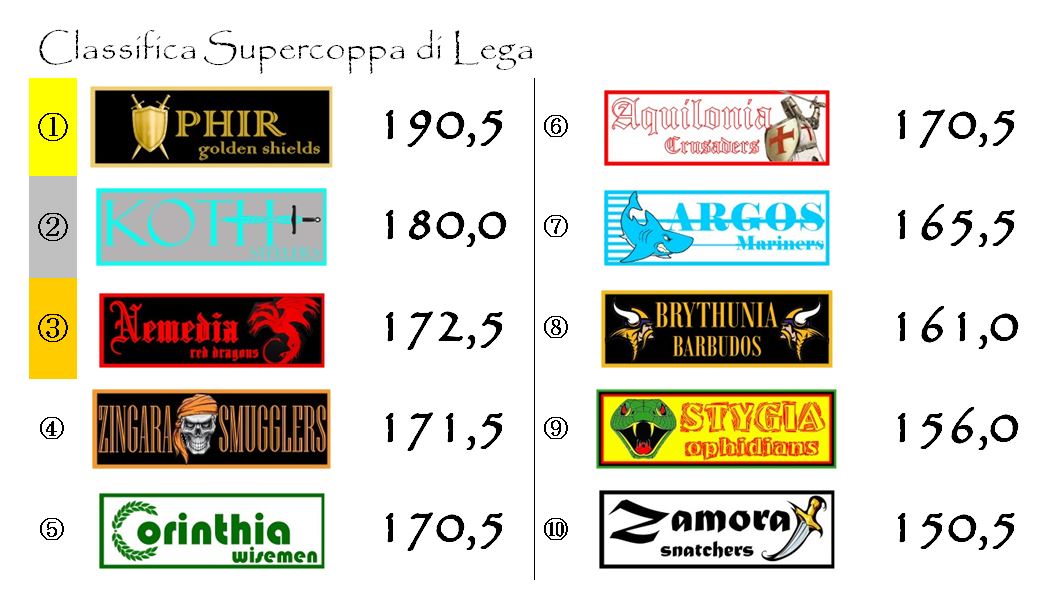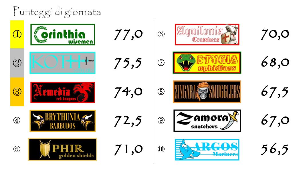 Lo scivolone di cui abbiamo accennato sopra ha fatto precipitare Argos, detentrice delle Spade d’Oro di Hyboria, dalla terza alla settima posizione.