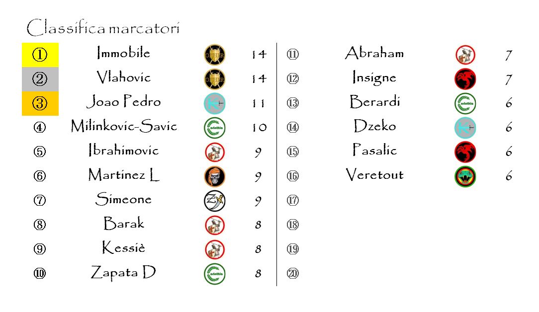 Anche Aquilonia ha fatto mettere a referto due reti (quelle di Tammy Abraham contro l’Empoli) ma i voti bassi di alcuni difensori e dello stesso Ibra hanno impedito ai campioni in carica di raggiungere la soglia della seconda rete costringendoli ad una resa per 2-1 che decreta il loro definitivo addio alle speranze di difendere il titolo conquistato, per la seconda volta, nella scorsa stagione.