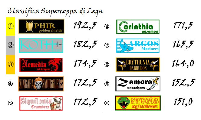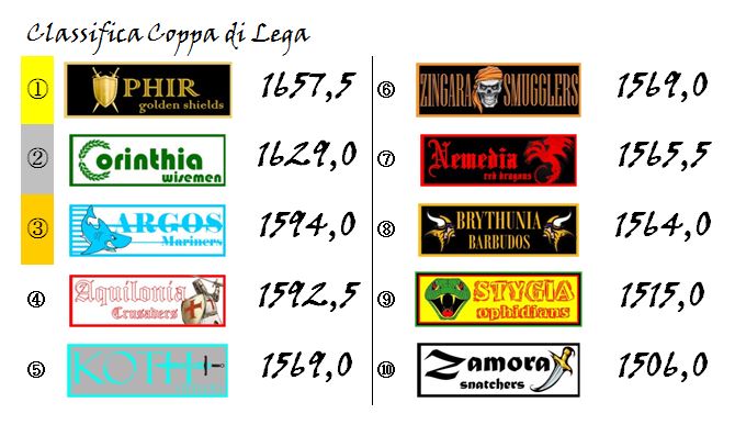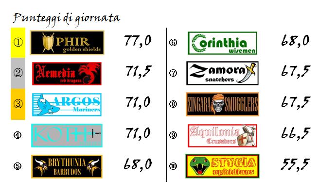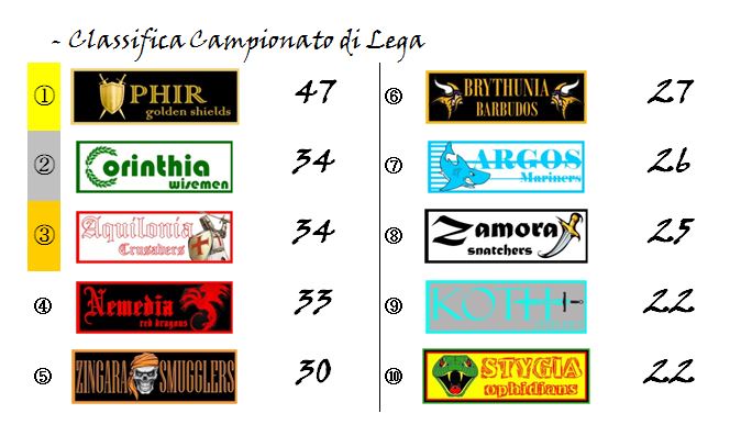 Grazie a questo successo, e a quanto accaduto sugli altri campi della nostra Hyboria League, Nemedia è prepotentemente rientrata nella corsa al podio tornando ad un solo punto da Aquilonia e Corinthia.