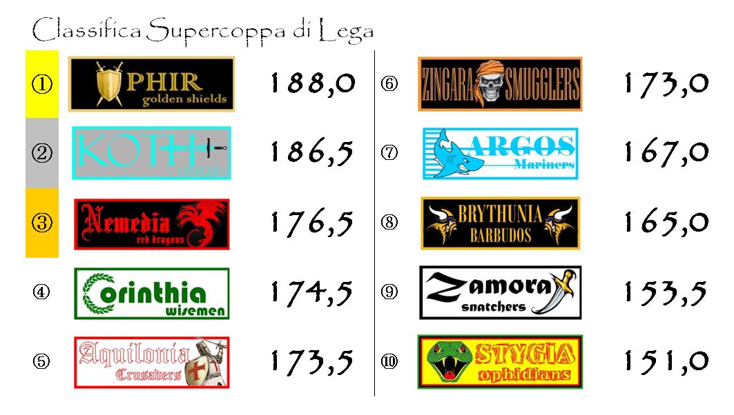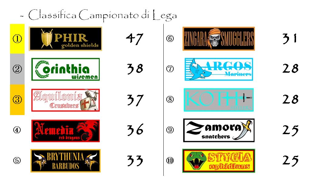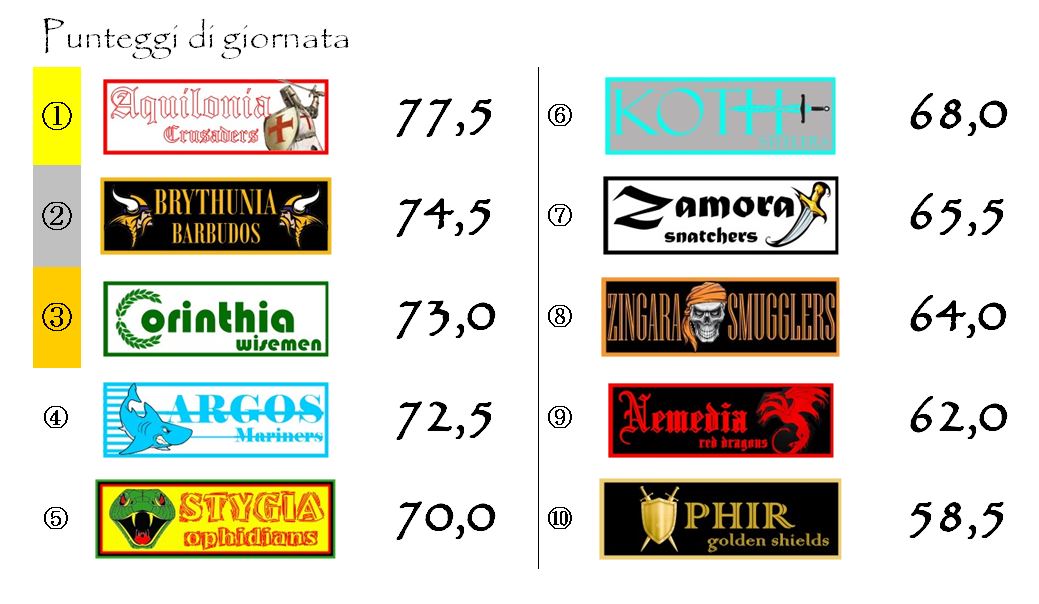 Nel frattempo, infatti, Aquilonia e Nemedia, principali rivali dei bianco-verdi nella corsa allo Scudo d’Argento, saranno impegnate entrambe in casa, rispettivamente contro Brythunia e Zingara. Parliamo di due avversarie che, anche se attraversano momenti diametralmente opposti, sono a loro volta non molto distanti dalla zona podio e possono ancora coltivare reali speranze di rientrare in lotta.