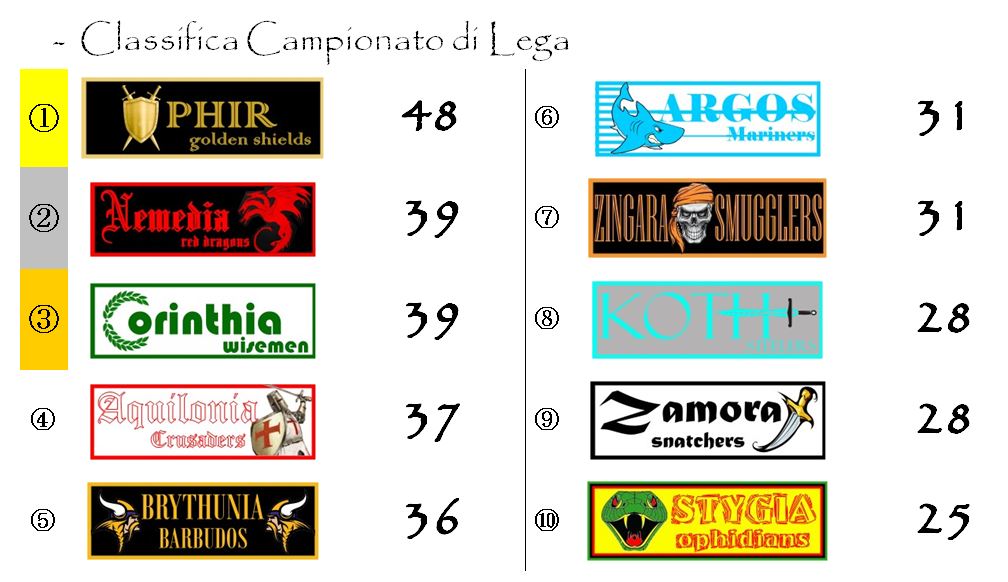 Aquilonia cercherà di riprendere in mano il proprio destino giocando per la seconda volta consecutiva in casa, questa volta contro gli Stygia Ophidians, attualmente ultimi e irrimediabilmente in declino come dimostrano le cinque sconfitte consecutive negli ultimi cinque scontri diretti contro i Crusaders.