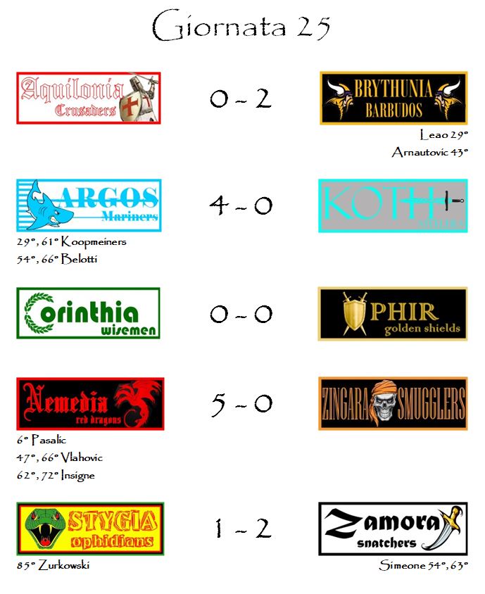 Le altre due reti che non abbiamo potuto tramutare in marcature utili per la nostra graduatoria sono state quelle di Traorè dei Koth Steelers e di Abraham degli Aquilonia Crusaders.