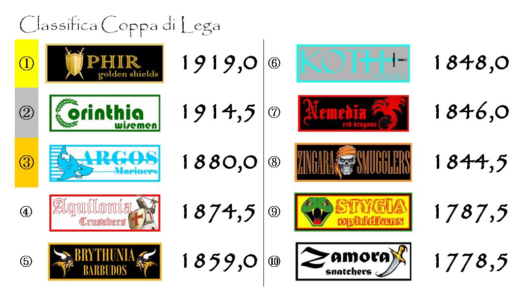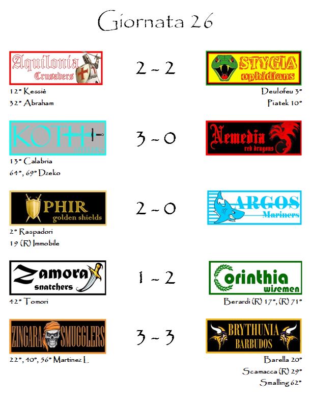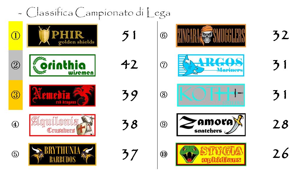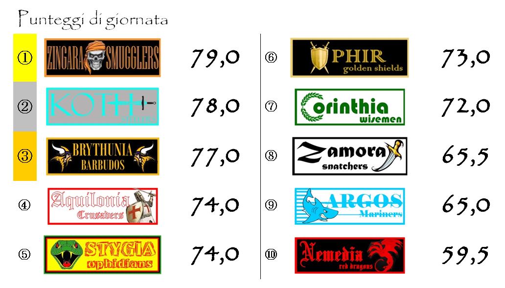 La miglior performance è stata quella di Aquilonia che ha fatto mettere a referto tre punti extra guadagnando una posizione ai discapito degli Zingara Smugglers, appaiandosi ai Corinthia Wisemen ed insediandosi a sole due lunghezze dal terzo gradino del podio momentaneamente occupato dai rivali nemediani.