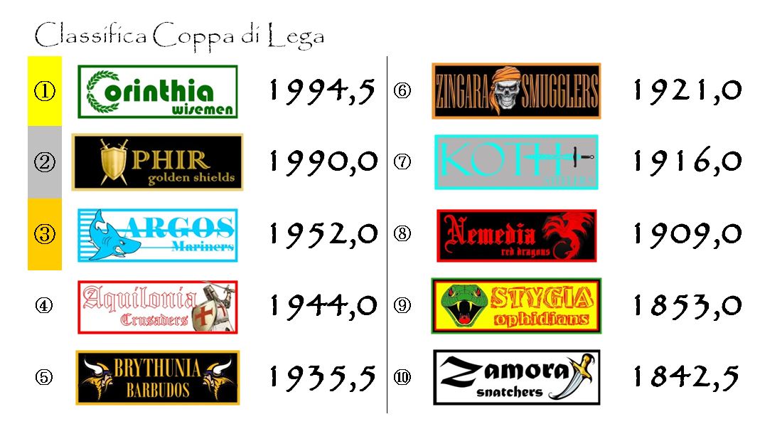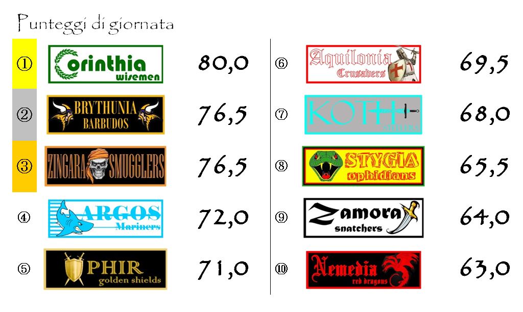 Alle spalle delle due prime della classe continua la lotta punto a punto tra Argos e Aquilonia. Ma occhio anche alla Brythunia perché i Barbudos sono ormai ad un tiro di schioppo da Mariners e Crusaders.