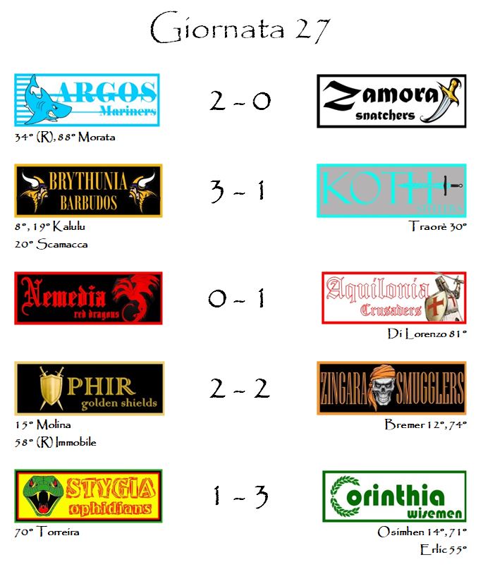 Le marcature extra che che siamo riusciti ad attribuire in questo ventisettesimo turno sono state tre e sono andate tutte a dei difensori: Bremer degli Zingara Smugglers, Kalulu dei Brythunia Barbudos e Di Lorenzo degli Aquilonia Crusaders.