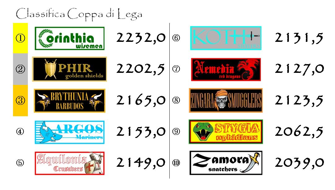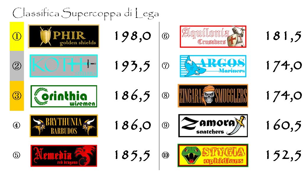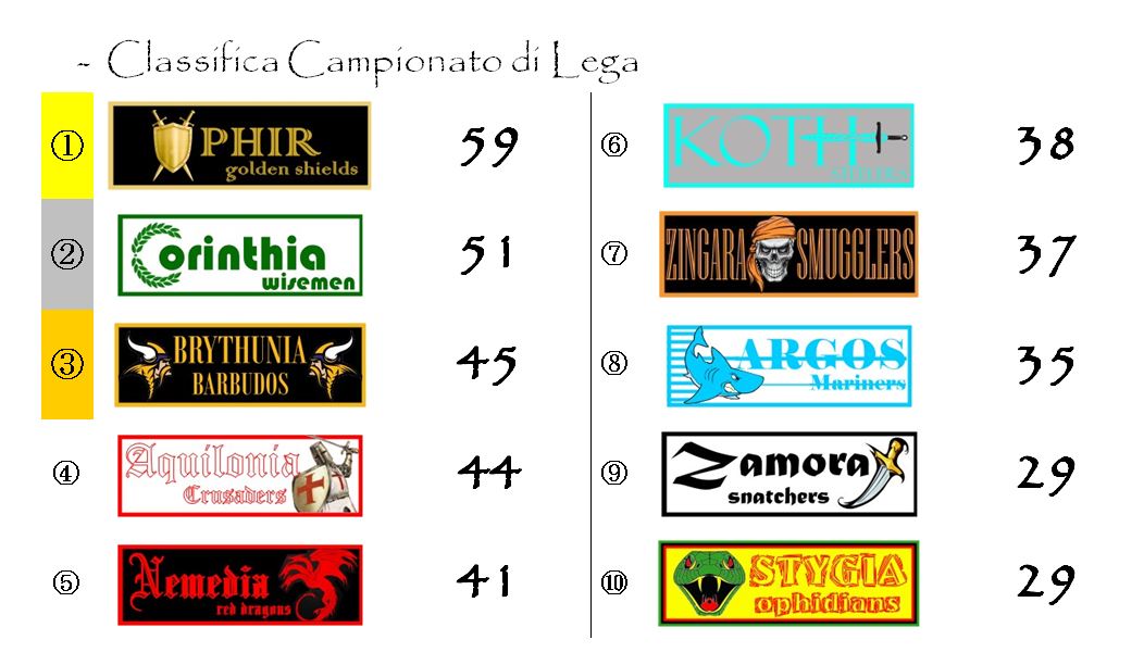 In terza posizione è prepotentemente salita la Brythunia che ha sorpassato sia Argos che Aquilonia e che, anche alla luce delle ultime prestazioni, diventa la favorita numero uno per l’Elmo di Bronzo.