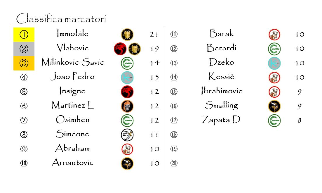 Al terzo posto ora troviamo Sergej Milinkovic-Savic, premiato con una marcatura extra come accaduto anche ad altri due capitani: Chris Smalling dei Brythunia Barbudos e Giorgio Chiellini degli Zingara Smugglers.