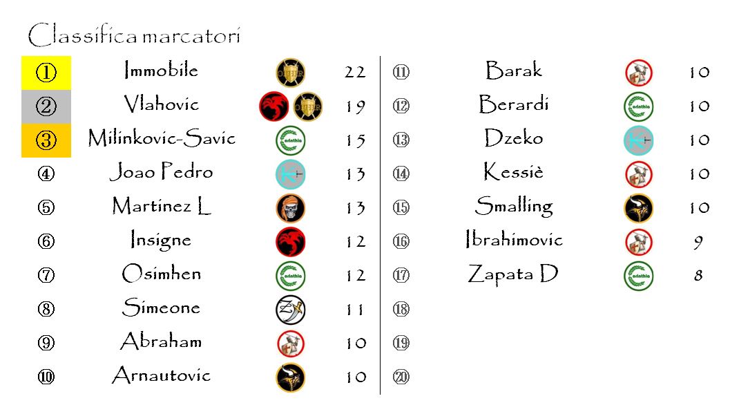 Anche questa settimana la classifica dei marcatori arride a Ciro Immobile.