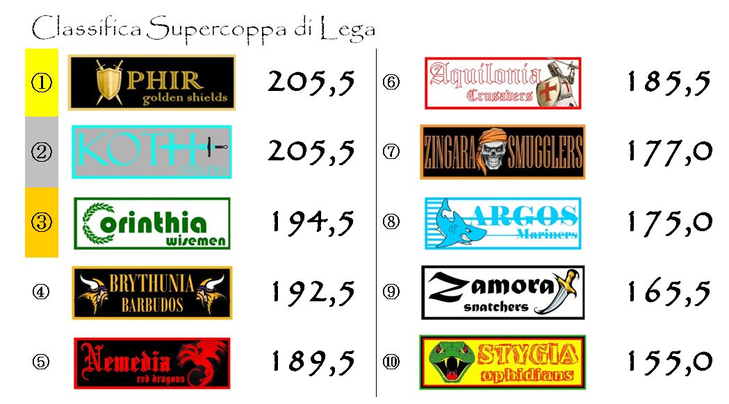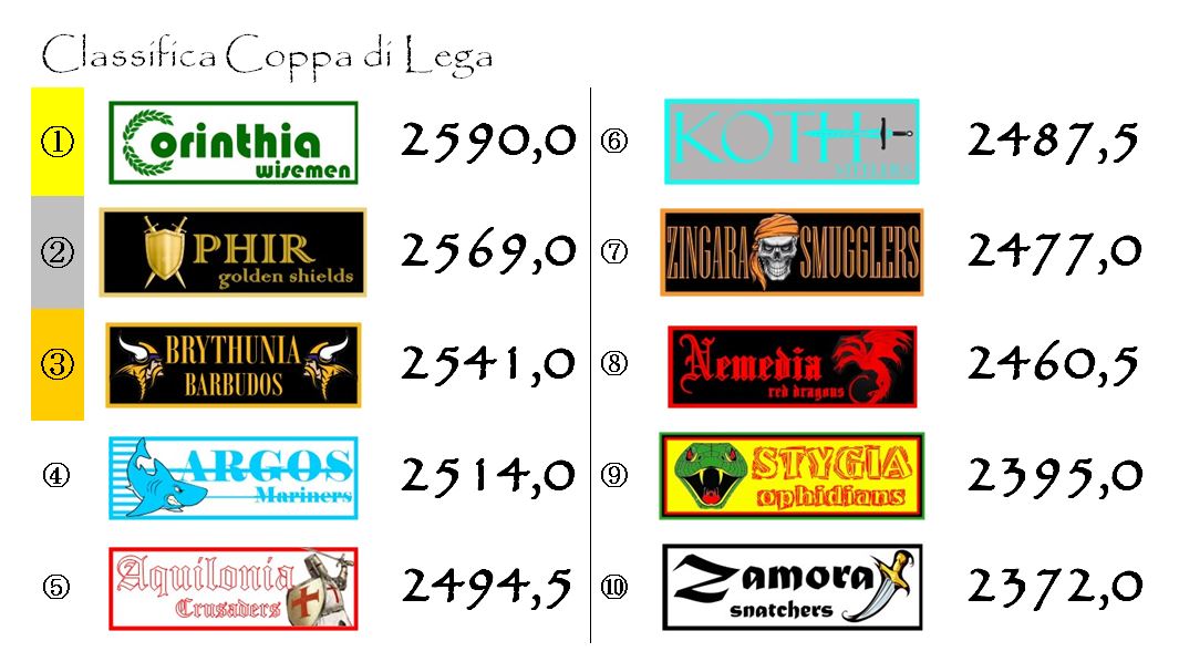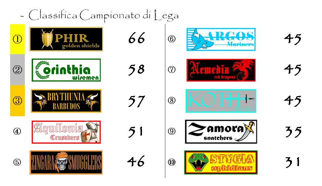 Corinthia è riuscita a guadagnare altri punti su Ophir e ora solo un tracollo verticale nell’ultimo potrebbe impedirle di vincere il primo Elmo d’Oro della sua storia. Un trofeo già sfiorato due stagioni fa in un duro testa a testa con gli Ophidians che vide questi ultimi prevalere sul filo di lana.