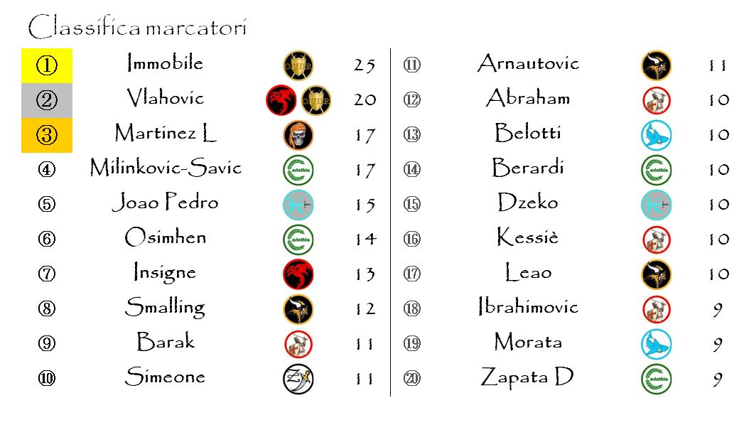 La terza posizione è occupata da Lautaro Martinez e Sergej Milinkovic-Savic che si giocheranno il tutto per tutto negli ultimi 90 minuti.