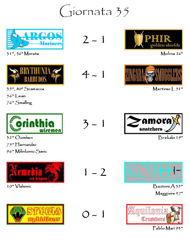 Il quadro degli incontri sarà chiuso da Zamora–Argos, partita che vedrà Dybala e Belotti congedarsi dai Mariners, squadra della quale sono stati simbolo sin dalla partenza di questa folle avventura fantacalcistica chiamata Hyboria League.