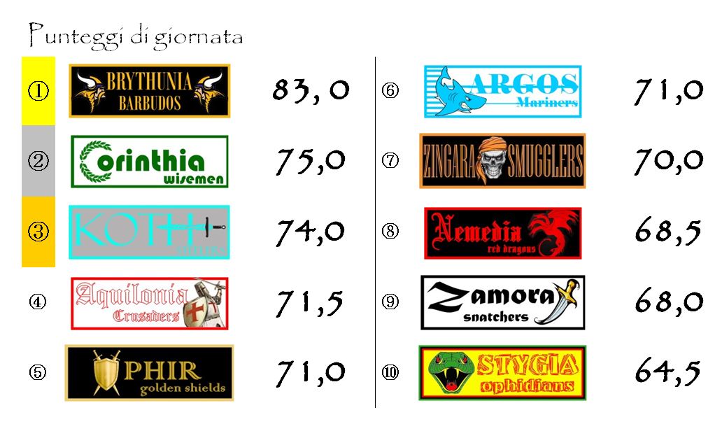 Per il terzo posto se la vedranno ancora una volta Corinthia è Brythunia anche se i due punti di vantaggio dei Wisemen fanno pendere il piatto della bilancia tutto dalla parte dei bianco-verdi.