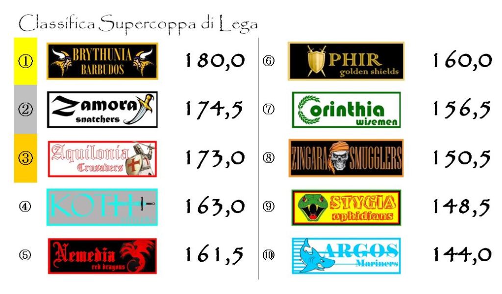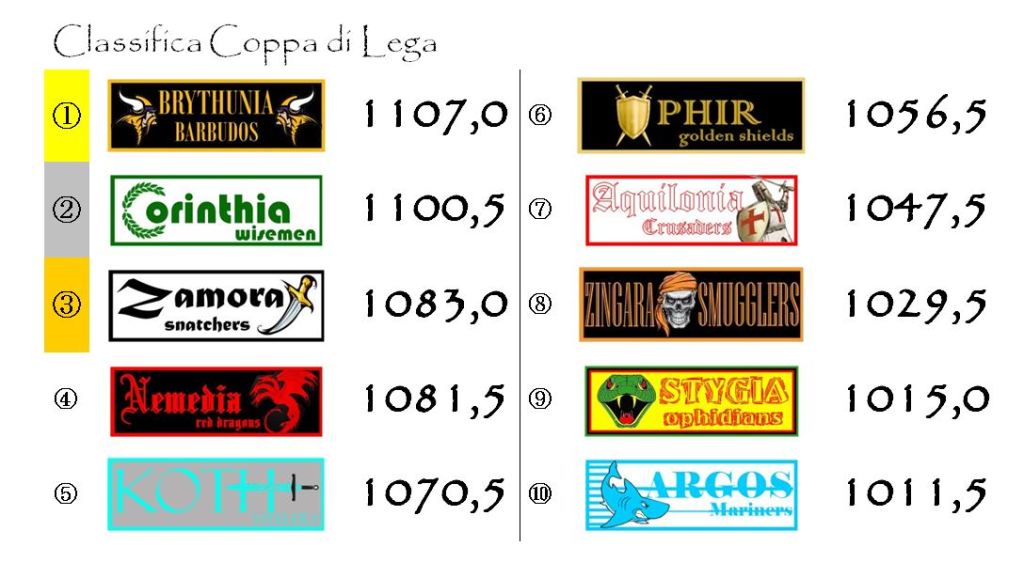 Dando per assodato l’enorme vantaggio della Brythunia in termini di punti e quello della Corinthia per qualità della rosa, credo che, alla fine, quella per il terzo posto sarà l’unica lotta aperta. E con una classifica così corta la Nemedia rimane una delle più serie candidate alla conquista dello Scudo di Bronzo.