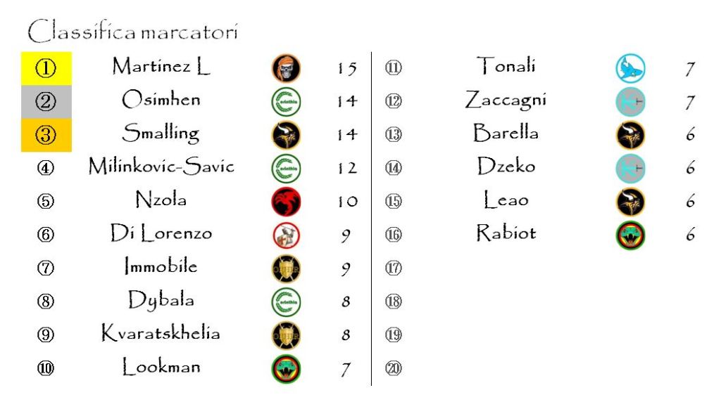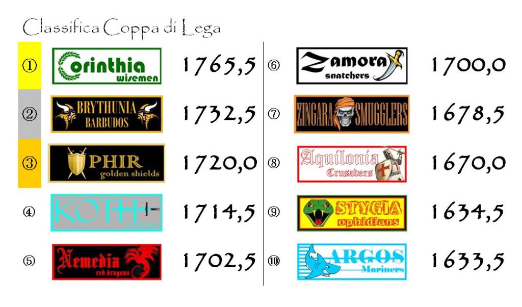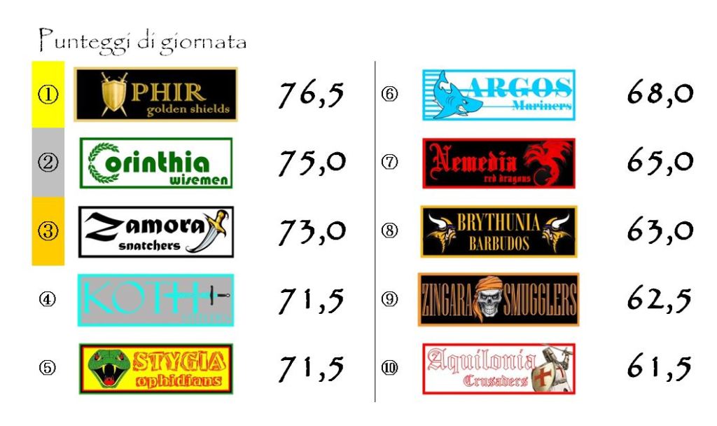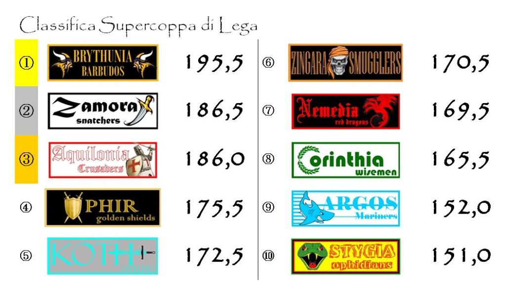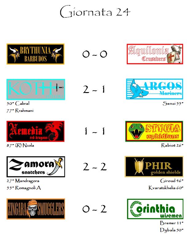 Il quadro degli incontri sarà completato dalla sfida tra Stygia e Aquilonia, le nobili decadute del nostro fantacalcio che, al momento, occupano le ultime due posizioni in classifica.