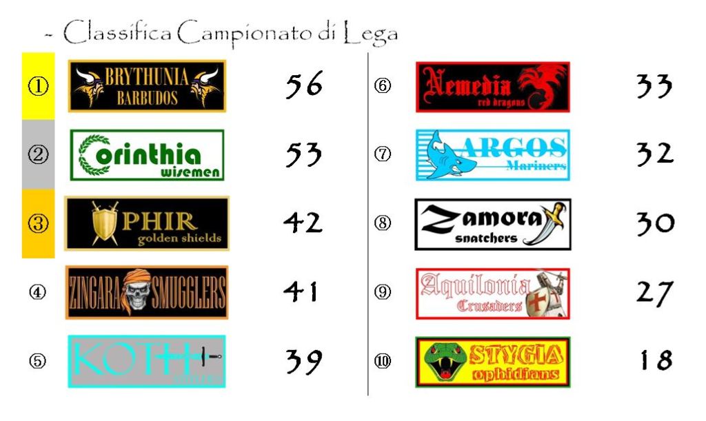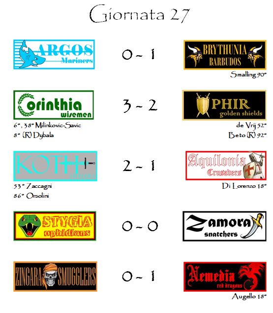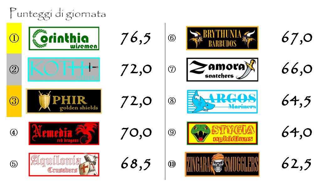 La lotta per il terzo posto ha sorriso ai Koth Steelers che hanno battuto in rimonta Aquilonia per 2-1 riavvicinando sia Ophir (sconfitta da Corinthia come raccontato pocanzi) che Zingara (che come vedremo ha perso in casa contro la Nemedia).