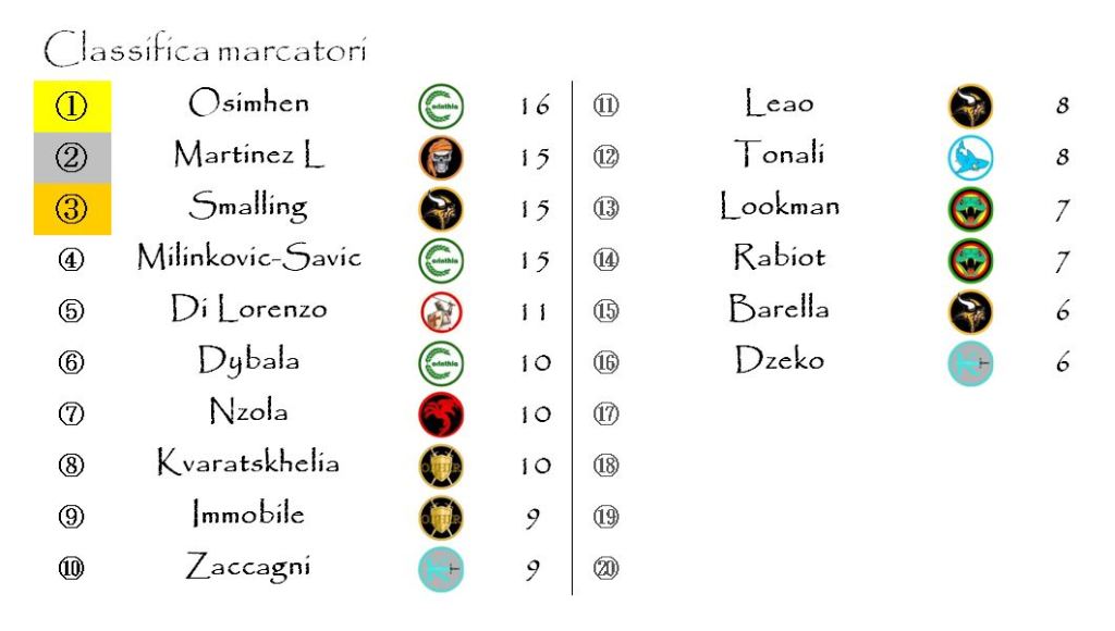 Il serbo e l’inglese, rispettivamente leaders di Corinthia e Brythunia (le due squadre che lottano per il titolo) sono riusciti ad agganciare Lautaro Martinez nella seconda posizione della nostra classifica dei marcatori.