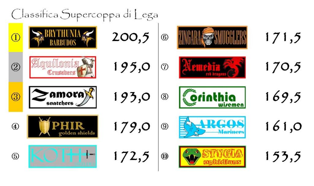 Invariata la situazione al vertice della Supercoppa di Lega. Brythunia e Aquilonia che hanno conquistato due punti ciascuna rimanendo a cinque lunghezze di distanza.