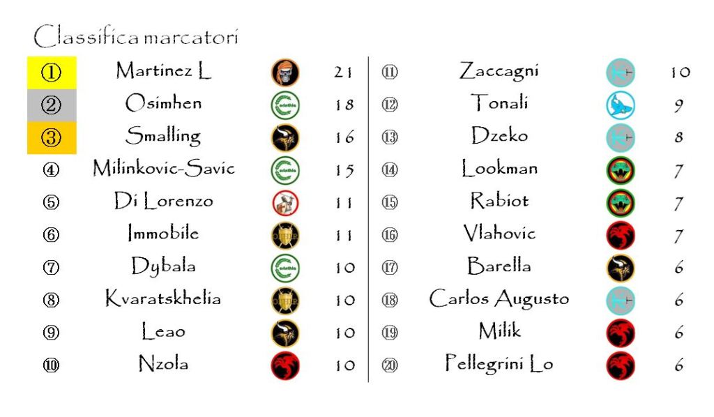 La corsa a due per la conquista dell’Elmo d’Oro continua a vedere l’argentino Lautaro Martinez in vantaggio di tre lunghezze su Viktor Osimhen.