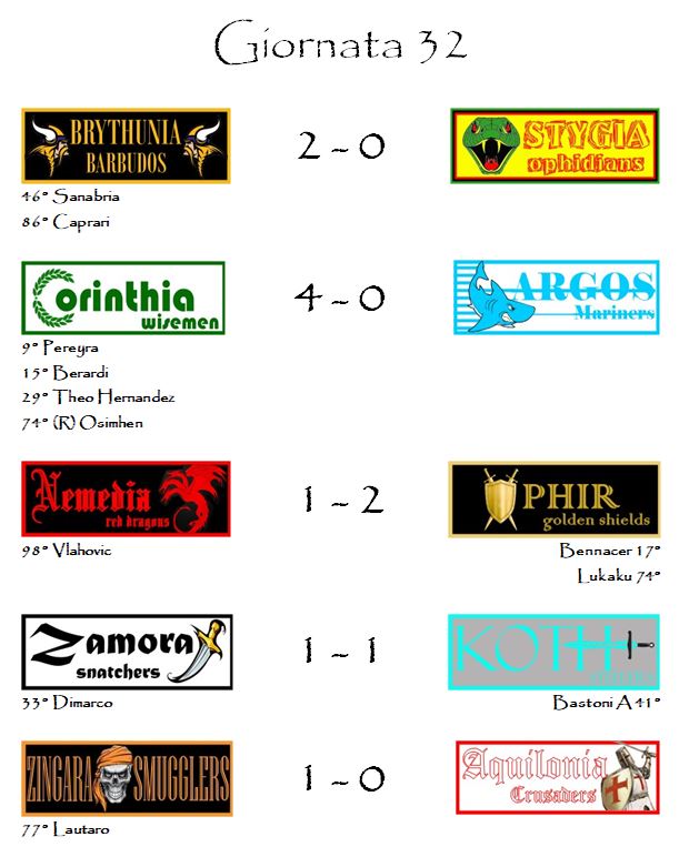 I Brythunia Barbudos, di turno al Conan Memorial di Tarantia contro gli Aquilonia Crusaders, avrebbero la possibilità di laurearsi matematicamente campioni facendo un punto in più dei Corinthia Wisemen impegnati nella difficile gara casalinga contro gli Zingara Smugglers.