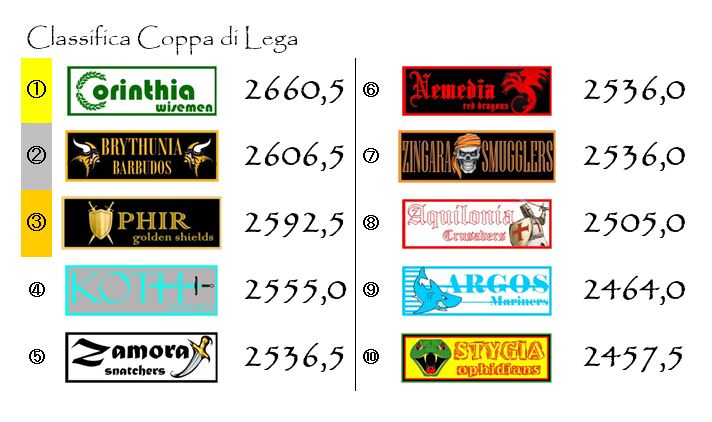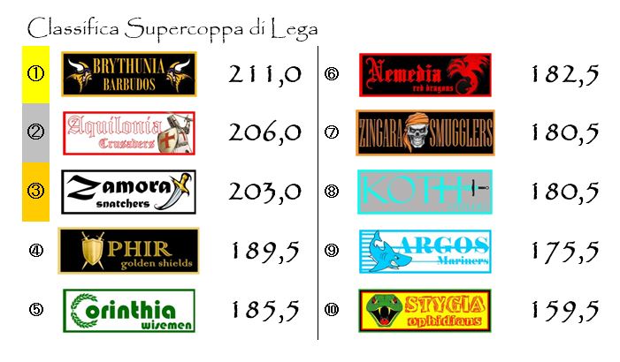 Elmo d’Argento ed Elmo di Bronzo sono stati vinti, rispettivamente, da Brythunia e da Ophir, a riprova della feroce dittatura che queste tre franchigie, monopolizzando i podi di Campionato e Coppa, hanno imposto in queste ultime due annate.