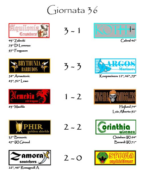 Le marcature extra che abbiamo potuto attribuire in questa giornata sono state tre e sono andate tutte a dei difensori: Di Lorenzo degli Aquilonia Crusaders, Maehle dei Nemedia Red Dragons e Romagnoli degli Zamora Snatchers.