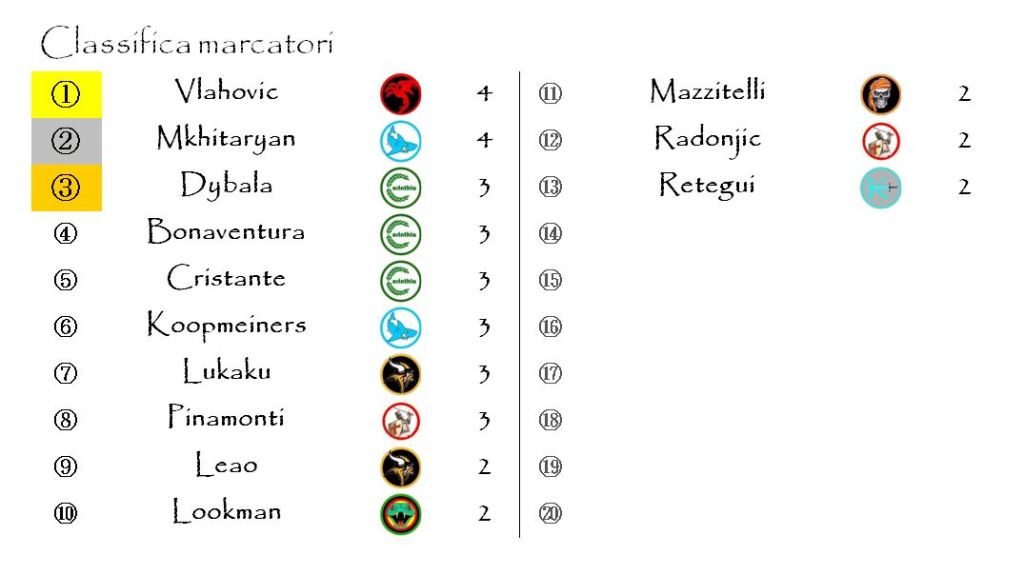 Le marcature extra che abbiamo potuto attribuire sono state tre e sono andate tutte e tre a dei capitani: Giovanni Di Lorenzo degli Aquilonia Crusaders, Matteo Pessina degli Argos Mariners e Adrien Rabiot degli Stygia Ophidians.