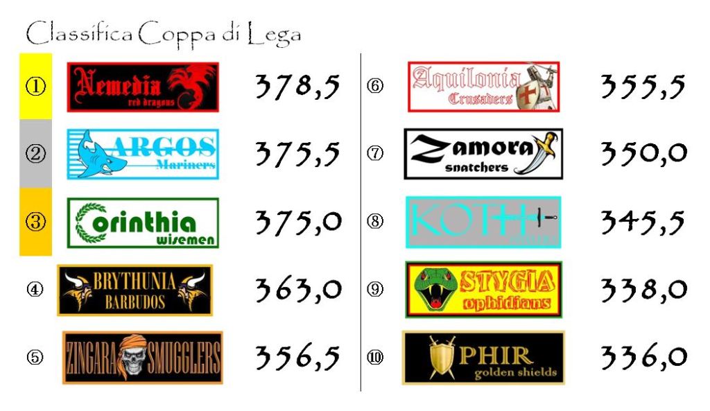 I Dragoni (che non sono ancora riusciti a vincere neanche una “V” nera e che hanno già incassato due sconfitte contro i Barbudos e i Wisemen) guidano la classifica della Coppa di Lega, quella che somma tutti i punteggi ottenuti durante la stagione.