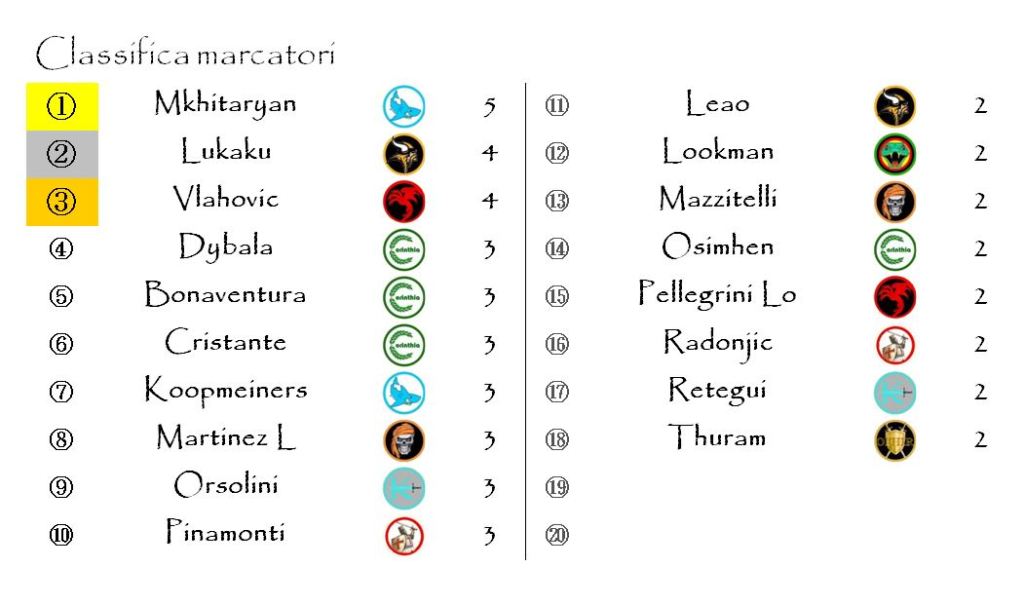 Due sono state, invece, le reti che non abbiamo potuto convertire in marcature utili per la nostra graduatoria. Si tratta di quelle (una per ciascuno) di Lautaro Martinez e Albert Gudmundsson.
