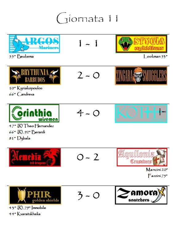 Le marcature extra che siamo riusciti ad attribuire in questa undicesima giornata sono andate una a Ciro Immobile, capitano degli Ophir Golden Shields, e due ai difensori Georgios Kyriakopoulos dei Brythunia Barbudos e Sam Beukema degli Argos Mariners.
