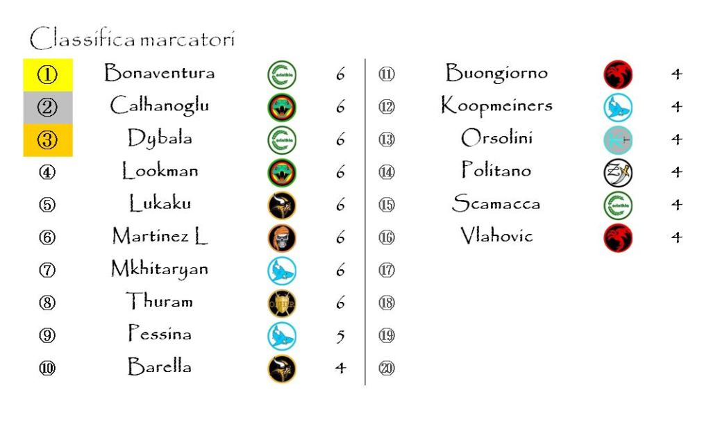 Le marcature extra che abbiamo potuto attribuire in questo turno di Hyboria League sono state quattro: sono andate a Matteo Pessina, Charles De Ketelaere, Alessandro Buongiorno e Paulo Dybala che è proprio uno degli otto in vetta alla classifica.