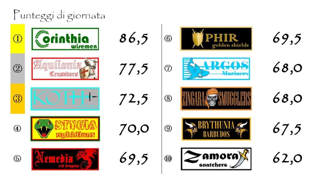 Anche in questo caso lo scatto in avanti dei Wisemen è stato fulminante. In virtù dell’ottimo punteggio e dei tre bonus extra conquistati in questo turno, Corinthia è riuscita a più che raddoppiare il vantaggio su Aquilonia.