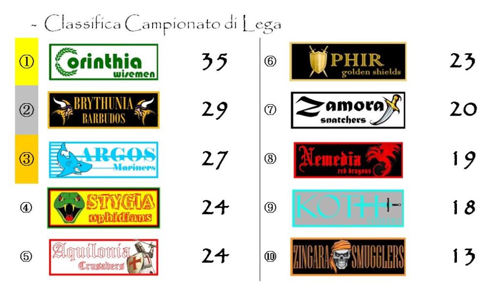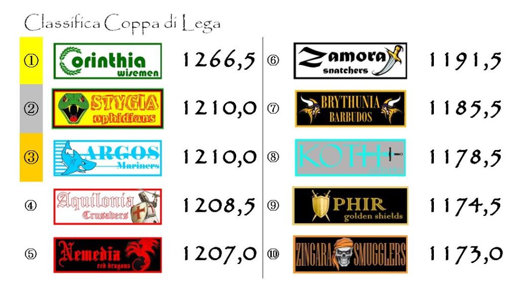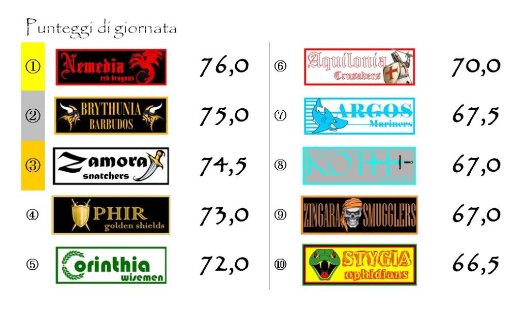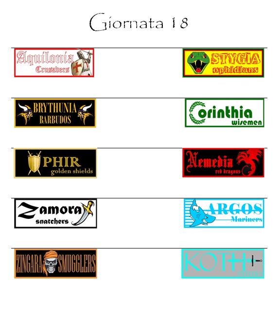 Argos sarà impegnata sul campo della Zamora mentre Aquilonia e Stygia, attualmente appaiate in quarta posizione, se la vedranno una contro l’altra al Conan Monumental di Tarantia.