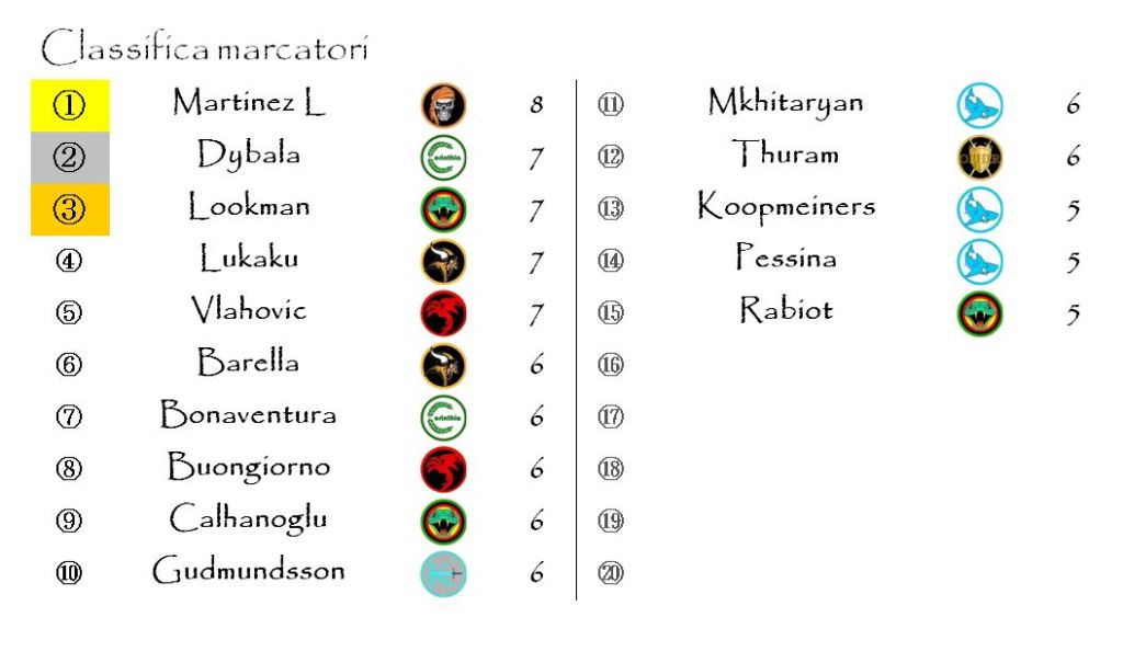 Tre sono state le marcature extra che abbiamo potuto attribuire in questo turno: sono andate a Danilo degli Ophir Golden Shields, Nicolò Barella dei Brythunia Barbudos e Martinez Quarta degli Stygia Ophidians.
