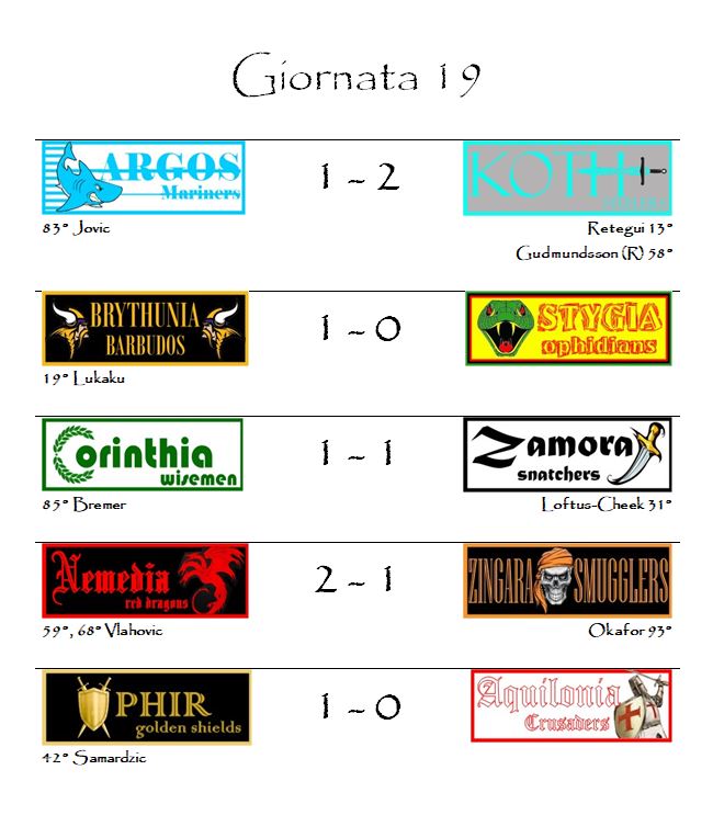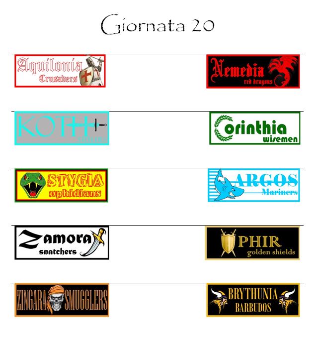 La gara più attesa del ventesimo turno sarà quella del Conan Memorial di Tarantia. Nello stadio più prestigioso del mondo hyboriano si affronteranno per la ventisettesima volta Aquilonia e Nemedia nel derby più sentito del nostro mondo fantacalcistico. Gli ospiti arrivano molto più carichi ma la partita sarà tutta da giocare.