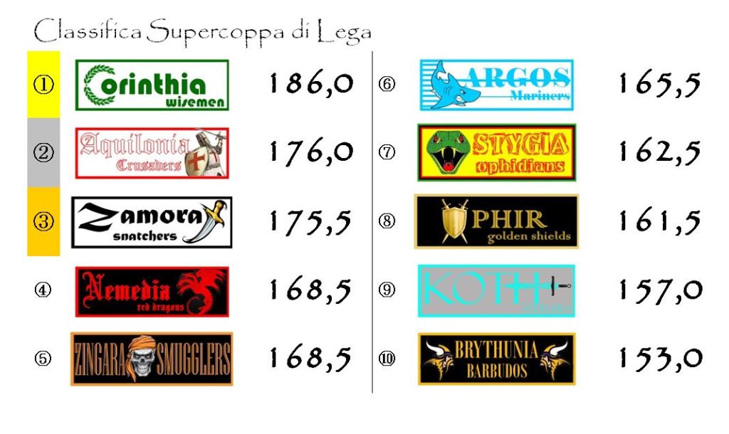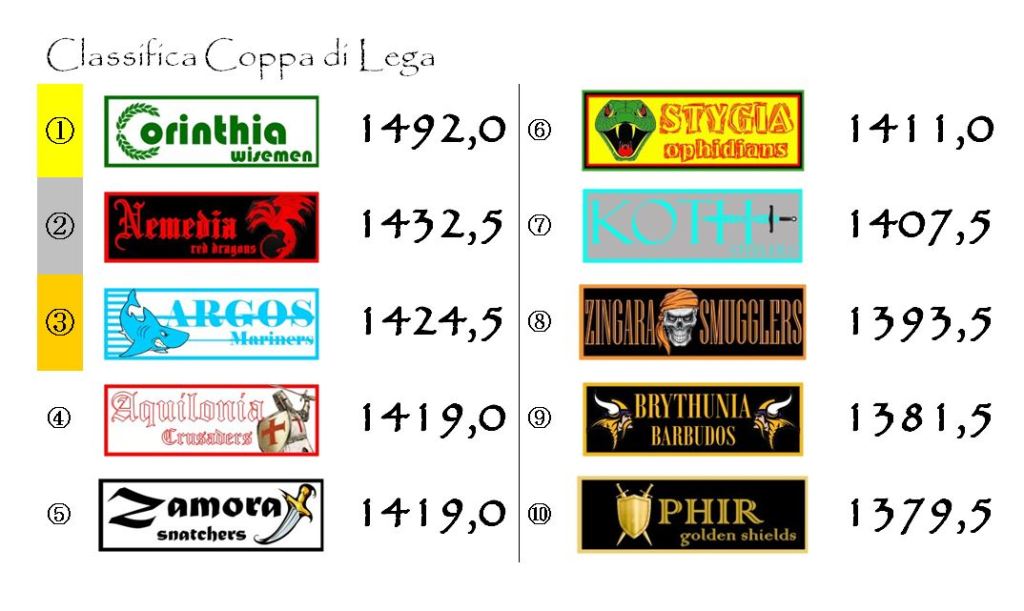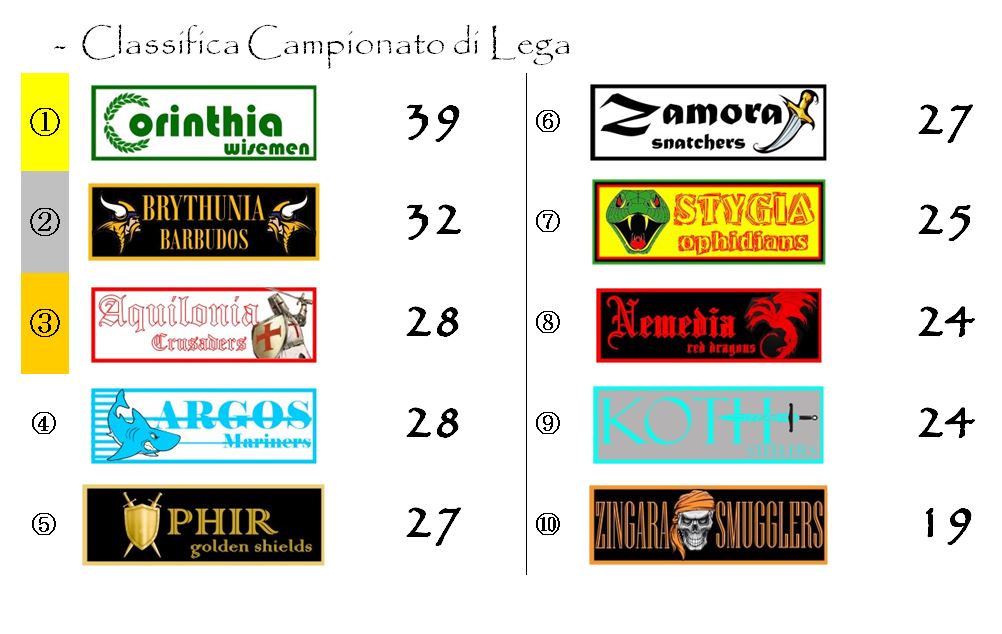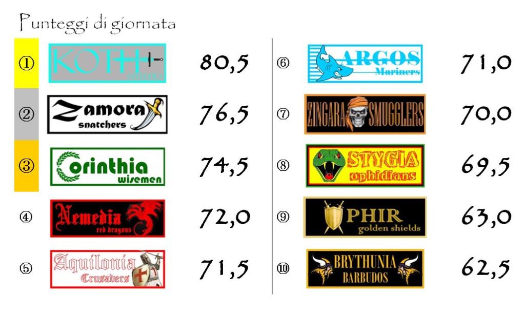 Elmo d’Argento ed Elmo di Bronzo saranno faccenda più delicata. Nessuna riesce a dare uno strappo deciso a metà classifica. Al momento si possono ritenere in corsa almeno sei squadre. Da Nemedia a Koth tutto è ancora possibile.