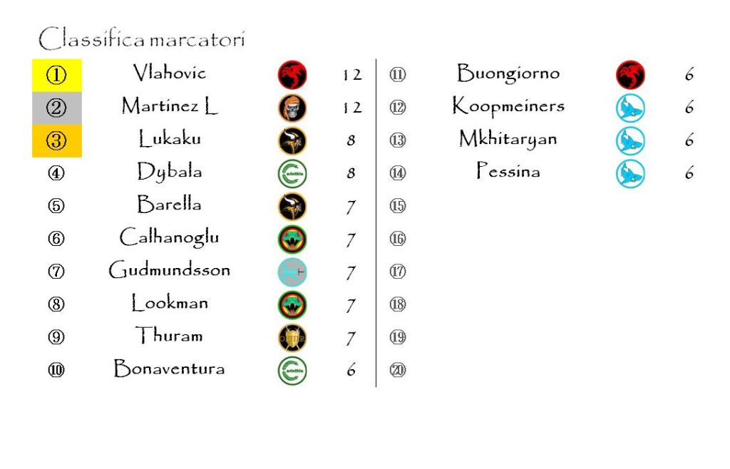 L’argentino è riuscito ad agganciare il serbo perché ha usufruito anche di una marcatura extra. Ne abbiamo potute assegnare sei in questo turno. Le altre cinque sono andate ad Alessio Romagnoli (Zamora Snatchers), Giovanni Di Lorenzo e Charles De Ketelaere (Aquilonia Crusaders) e Mateo Retegui e Davide Calabria (Koth Steelers).