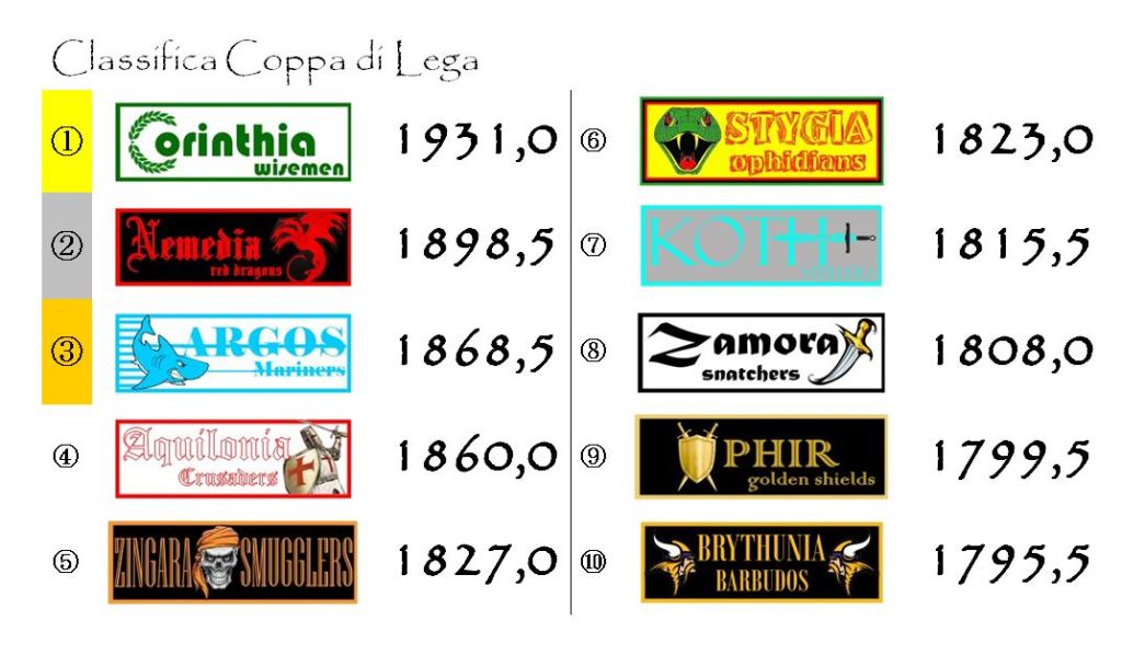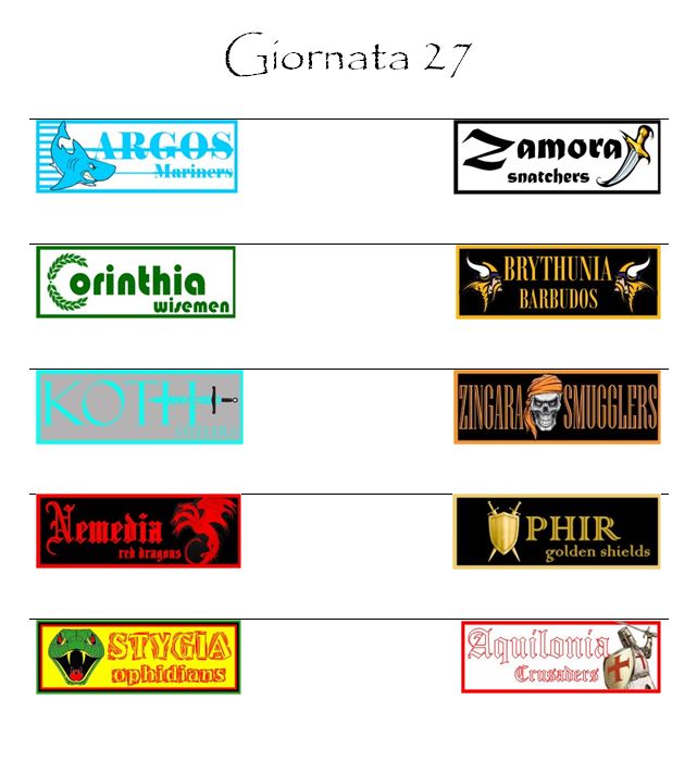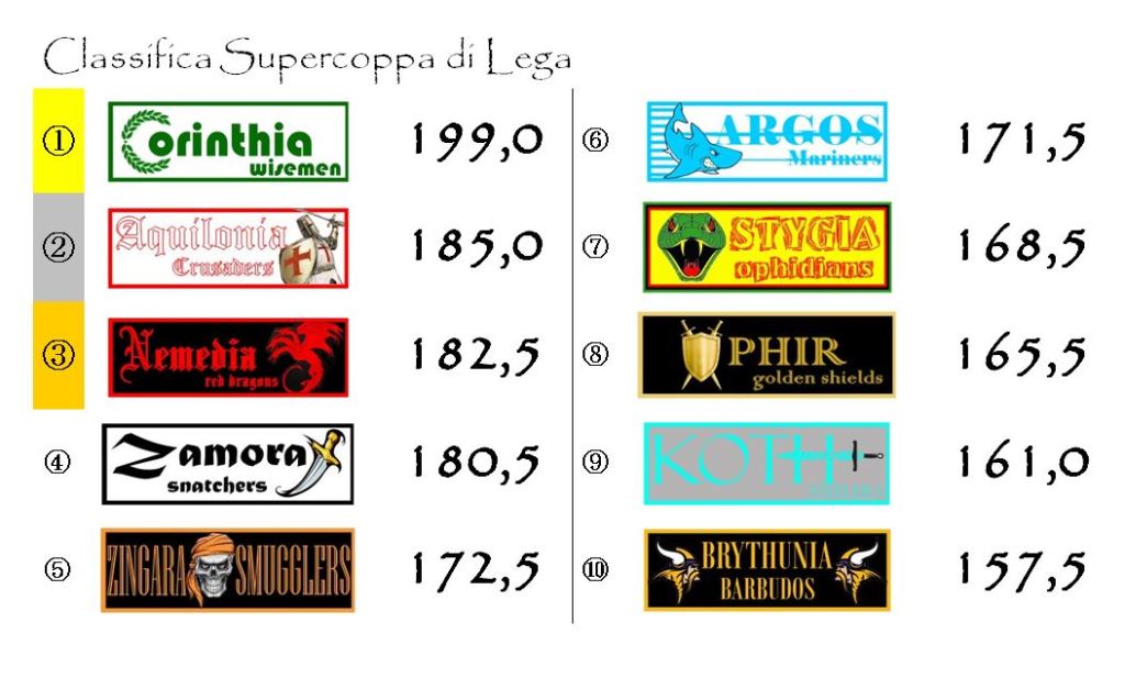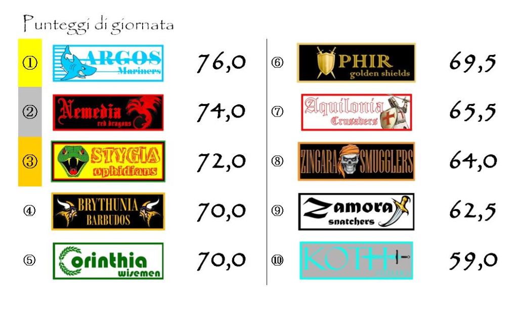 Aquilonia, attualmente sul gradino più basso del podio, sarà ospite degli Stygia Ophidians, che sono quinti, staccati di quattro lunghezze. Nemedia, che al momento è quarta, ospiterà al Belverus Dome gli Ophir Golden Shields, sesti a soli due punti di distanza.